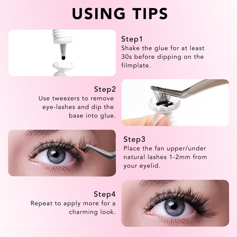Il processo di candidatura è semplice e semplice. Inizia selezionando i cluster di ciglia desiderati e disponendoli su una superficie piana. Quindi, applica una piccola quantità di colla per cluster per ciglia fai -da -te alla base di ciascun cluster. Lascia asciugare la colla per cluster per ciglia fai -da -te per alcuni secondi e quindi premere delicatamente i cluster sulle ciglia naturali.